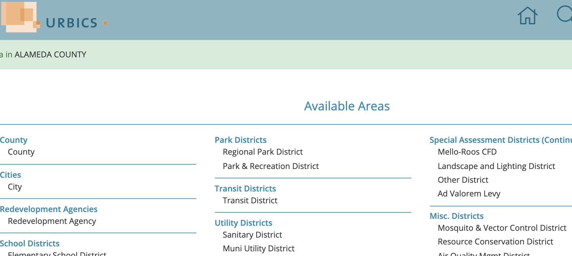 Comprehensive coverage.Urbics is designed around property tax jurisdictions - cities, schools, special assessment districts, hospital districts, water districts and many other types of taxing entities. Unlike demographic or real estate services using zip code or census tract boundaries, the boundaries of these jurisdictions are defined by the state and counties using tax codings and parcel numbers - the same way they are defined for bond issues and local property tax allocations. In addition to counties, cities, community colleges and school districts, our 30,000-plus jurisdictions include Mello-Roos community facilities districts, assessment districts and landscape and lighting districts as well as special districts such as hospital districts, community service districts, water districts, redevelopment project areas and more. Urbics provides subscribers with additional tools to track your areas in a portfolio and to create new areas where one doesn't yet exist - such as for a new bond issue that consolidates several existing taxing districts. You can learn more about how areas are defined in Urbics here.